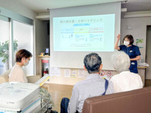 また、大島看護師からは、炭酸飲料やスポーツドリンク、経口補水液などを例に、飲み物に含まれる糖質量の違いについて紹介があり、身近な生活習慣を見直すきっかけづくりとなりました。